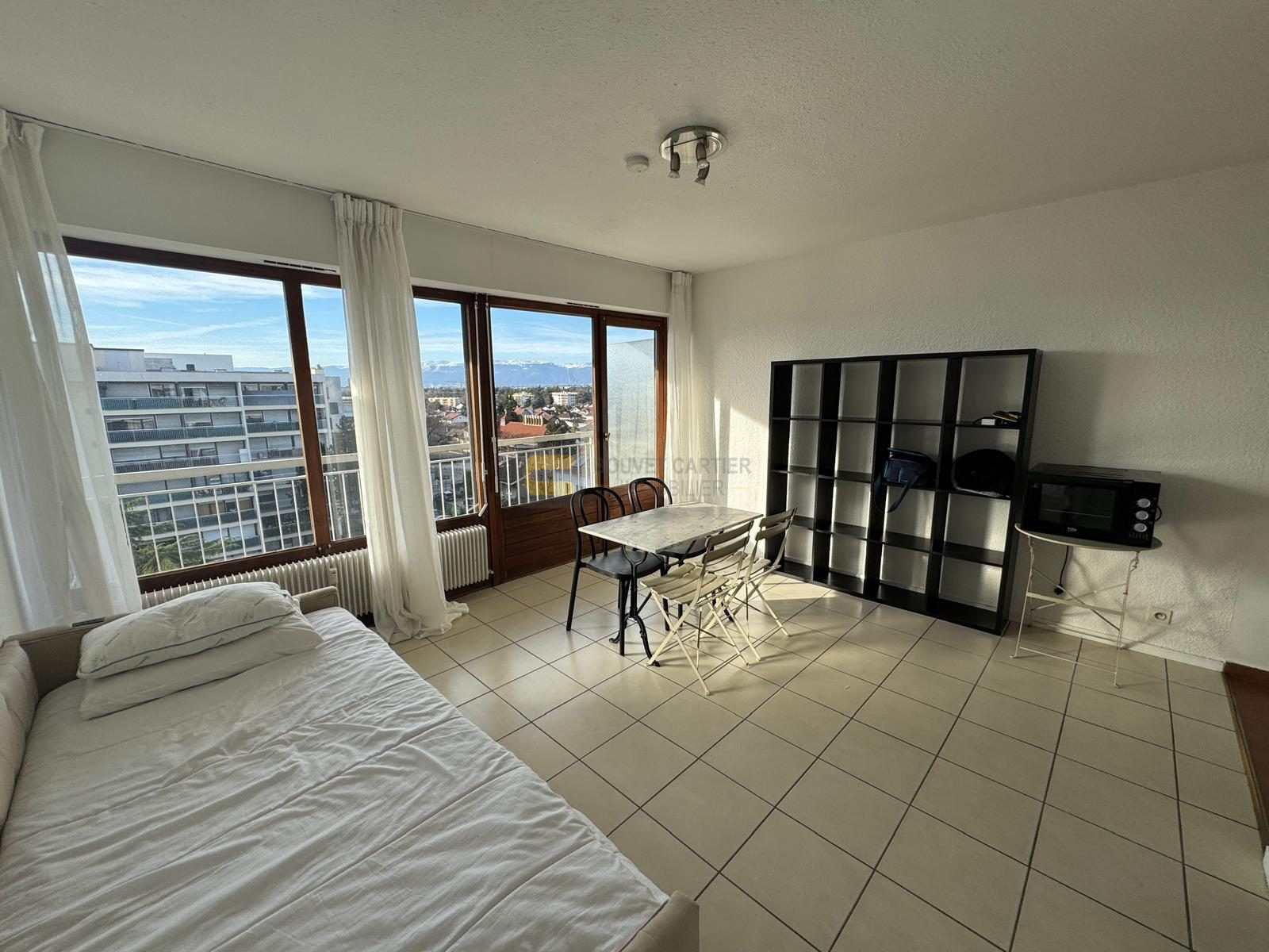A vendre studio lumineux au sixième et avant dernier étage avec ascenseur , libre de toute location. Il dispose d'un joli balcon filant en exposition SUD/ OUEST avec magnifique vue Salève et Jura au calme. Le bien se compose d'un hall d'entrée, une salle de bains, wc séparés, une pièce de vie avec coin kitchenette ouvrant sur le balcon. Le bien dispose d'une cave de 5 m².Proche commodités avec la voie verte à 50m, proximité des 3 douanes( mon idée, Pierre à Bochet et Moillesulaz), TRAM. Le parking collectif de la résidence est sécurisé par une barrière. IDEAL INVESTISSEURS!