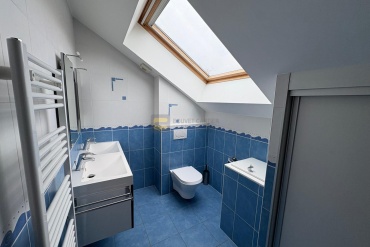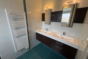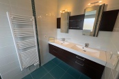Au niveau supérieur : l’étage distribue quatre grandes chambres, chacune avec un placard, une salle de bains avec WC et vide-linge.