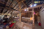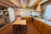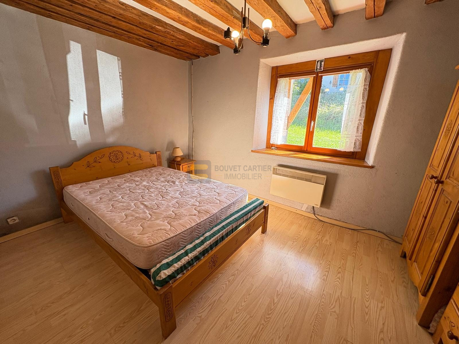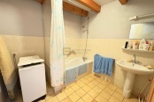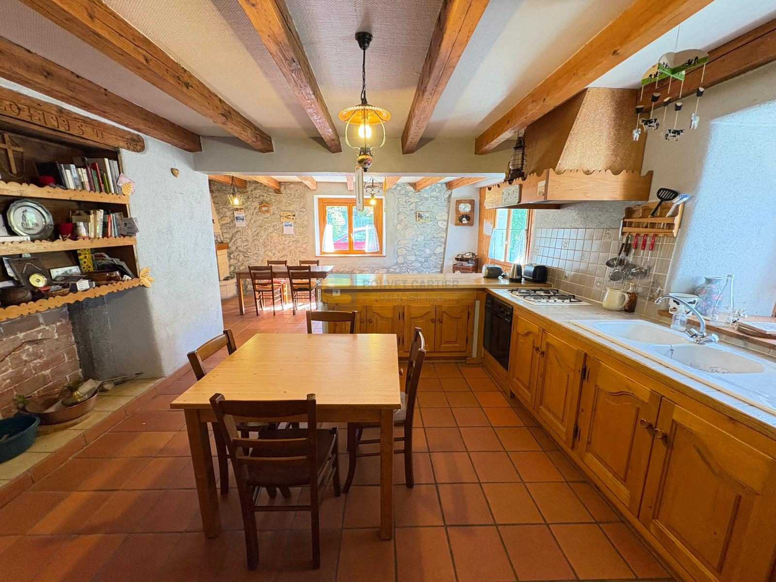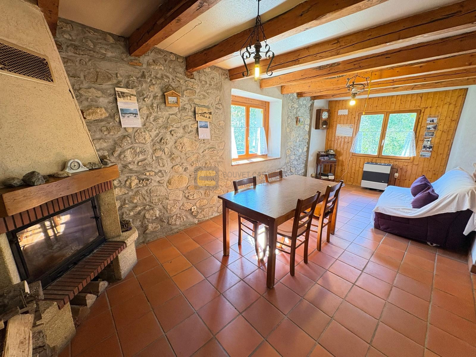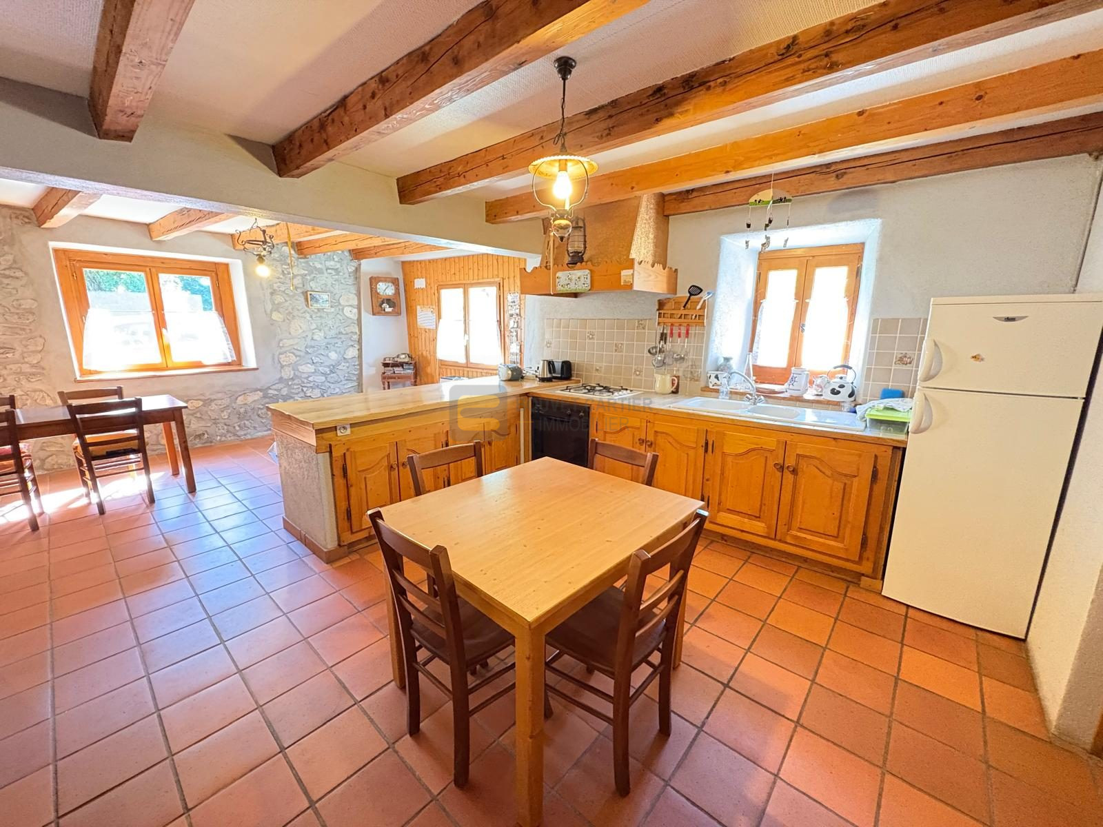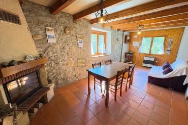 La maison principale en rez-de-chaussée, se compose d'un sas d'entrée, une grande cuisine ouverte sur le séjour avec sa chaleureuse cheminée authentique, une chambre, une salle de bains et un WC séparé. Les matériaux rustiques y sont à l’honneur : poutres apparentes, murs en pierres, tomettes au sol… Et ceci pour une surface de 67,22 m².