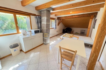 A l'étage, un appartement T3 indépendant d'environ 60,37 m², accessible par un escalier extérieur couvert. Il comprend une kitchenette ouverte sur un séjour, une chambre mansardée, une pièce borgne pouvant accueillir un coin couchage, un bureau ou une salle de jeux, une salle d'eau et un WC séparé.