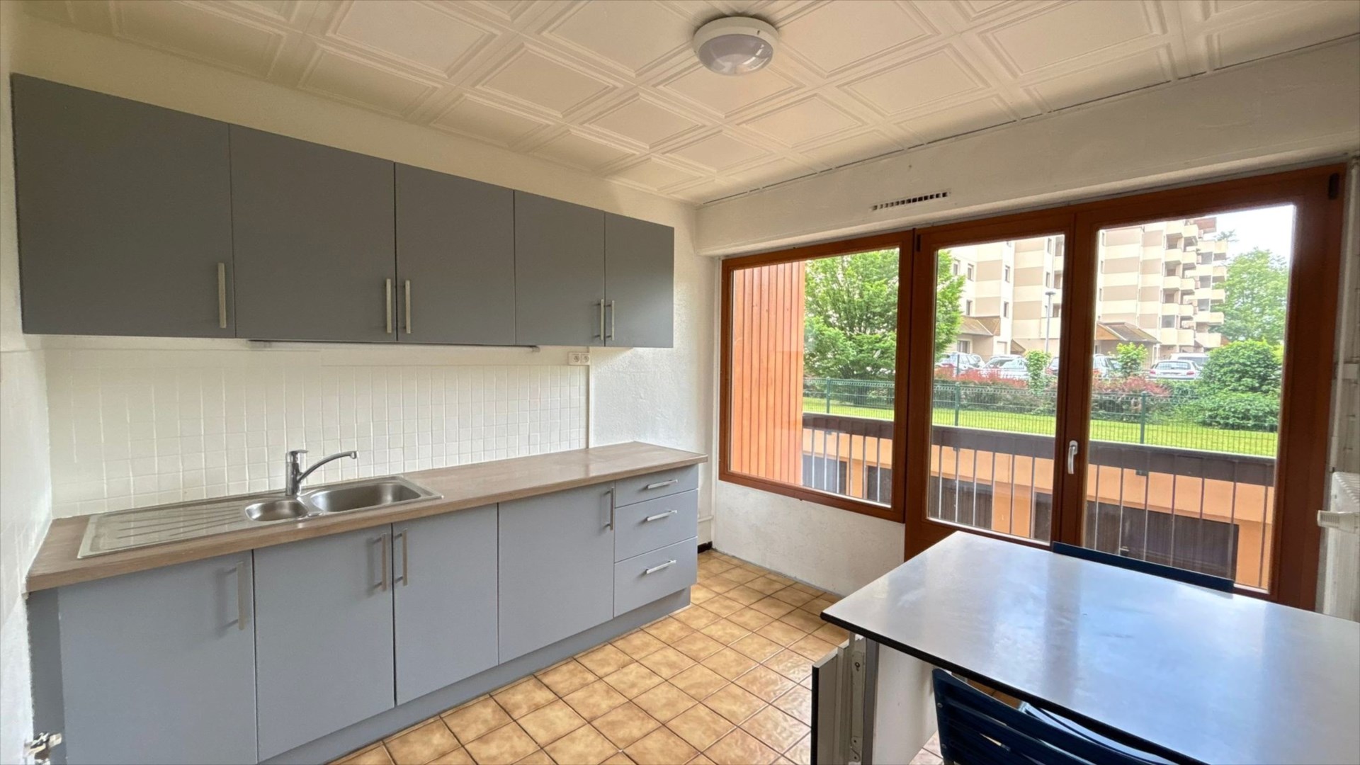 AMBILLY, Rue des Marronniers, proche douane Mon idée et du parc d'Ambilly, à louer appartement traversant 2 pièces au rez de chaussée comprenant cuisine aménagée, grand balcon au calme, nombreux rangements. Parking collectif et cave. Disponible le 09/04/26 (Réf 10226).