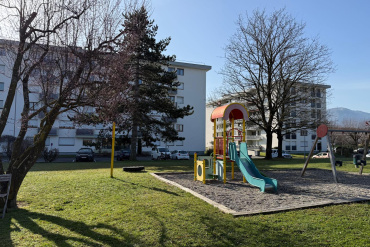 Jeux d'enfants et grands espaces verts dans la copropriété fermée et sécurisée.