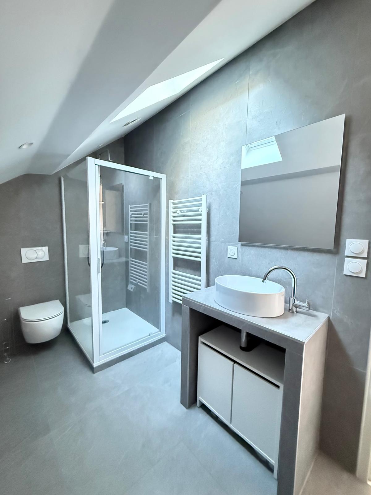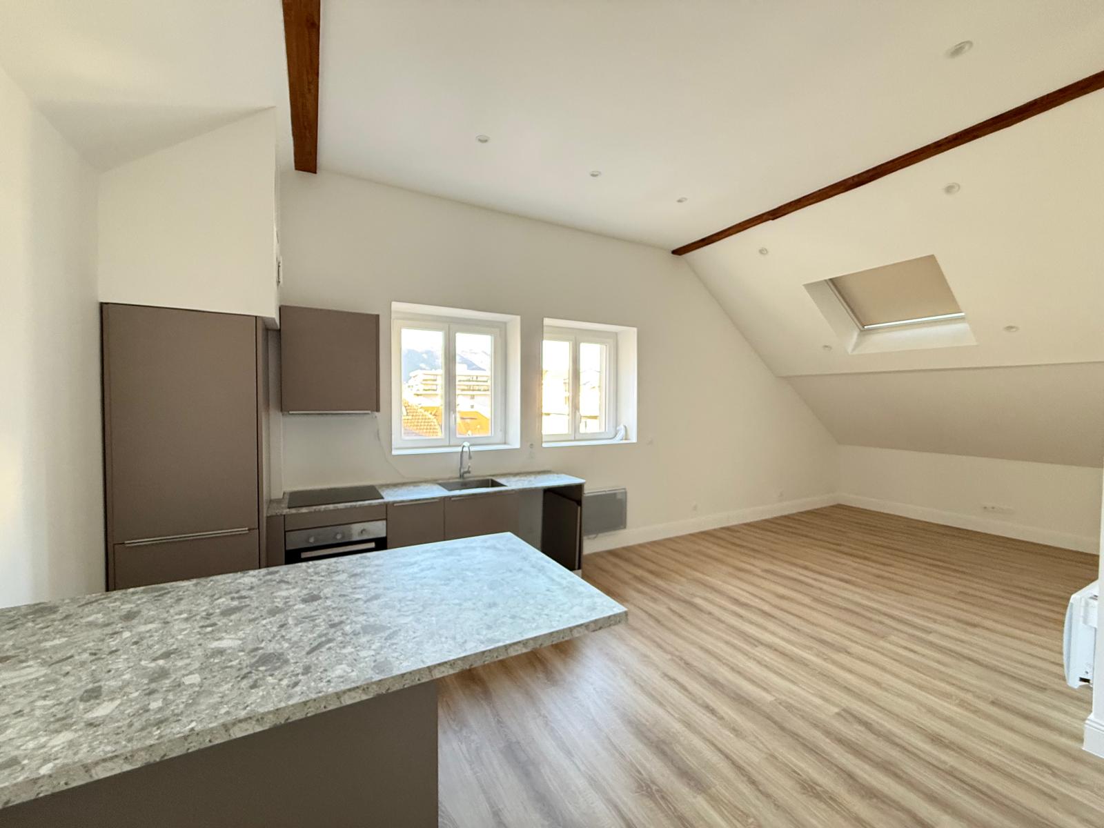 ANNEMASSE - Centre ville proche rond point de l'étoile, appartement 2 pièces à louer au dernier étage sans ascenseur. Comprenant une cuisine équipée ouverte sur le salon, une salle de douche avec wc, et une chambre.