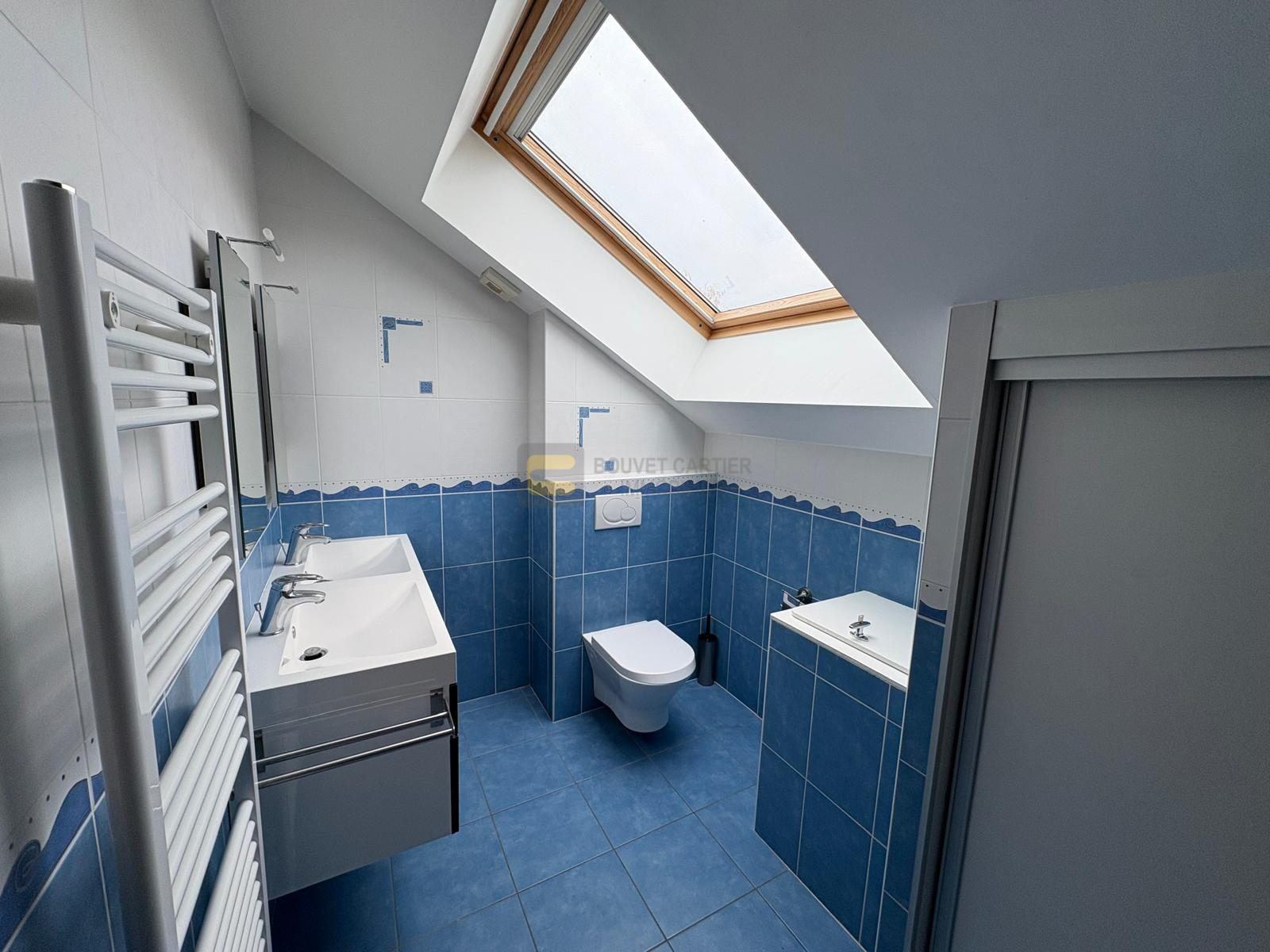 Au niveau supérieur : l’étage distribue quatre grandes chambres, chacune avec un placard, une salle de bains avec WC et vide-linge.