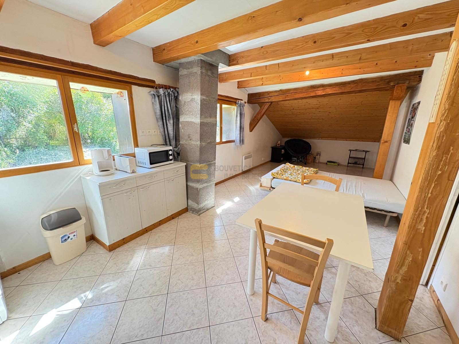 A l'étage, un appartement T3 indépendant d'environ 60,37 m², accessible par un escalier extérieur couvert. Il comprend une kitchenette ouverte sur un séjour, une chambre mansardée, une pièce borgne pouvant accueillir un coin couchage, un bureau ou une salle de jeux, une salle d'eau et un WC séparé.