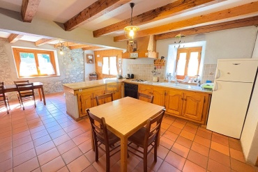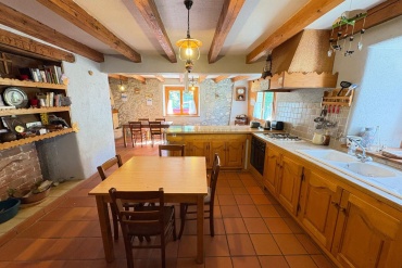 La maison principale en rez-de-chaussée, se compose d'un sas d'entrée, une grande cuisine ouverte sur le séjour avec sa chaleureuse cheminée authentique, une chambre, une salle de bains et un WC séparé. Les matériaux rustiques y sont à l’honneur : poutres apparentes, murs en pierres, tomettes au sol… Et ceci pour une surface de 67,22 m².