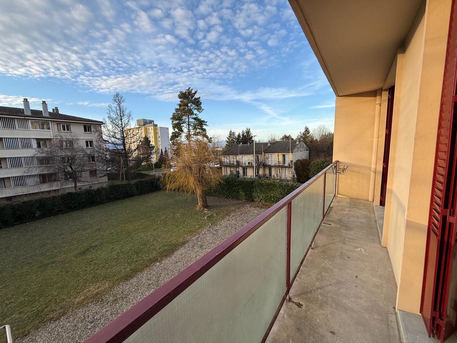 ANNEMASSE, route de Livron, au 1er étage d'une petite copropriété à proximité du centre commercial Le Praz du Léman et au pied des lignes de bus, à louer appartement trois pièces à louer, comprenant une entrée avec placard, un séjour avec rangements et balcon, une cuisine équipée séparée du séjour (hotte, plaques au gaz de ville, four) avec véranda, salle de bain et WC separés, 2 chambres dont 1 avec accès au balcon.