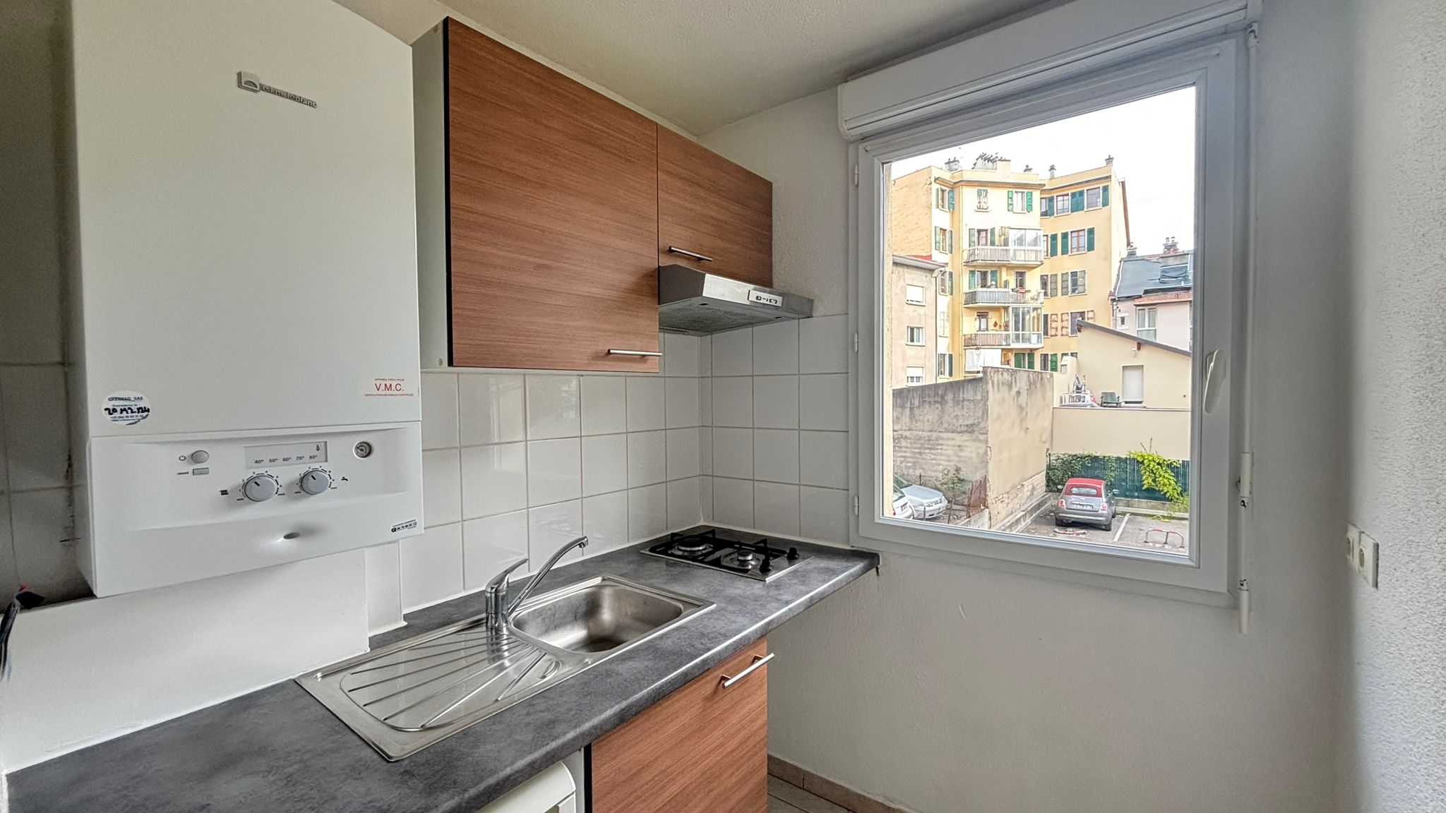 ANNEMASSE, secteur centre ville / Gare , idéalement situé en plein cœur d’Annemasse, à deux pas des commerces, transports (Tram, gare CEVA) et de la frontière suisse, A louer charmant T2 très lumineux de 45,59 m² au 1er étage. Il se compose d'une kitchenette ouverte sur le séjour donnant sur un balcon, un espace nuit avec salle de bains, WC séparés et une chambre. Une place de parking privée en sous sol complète ce bien.